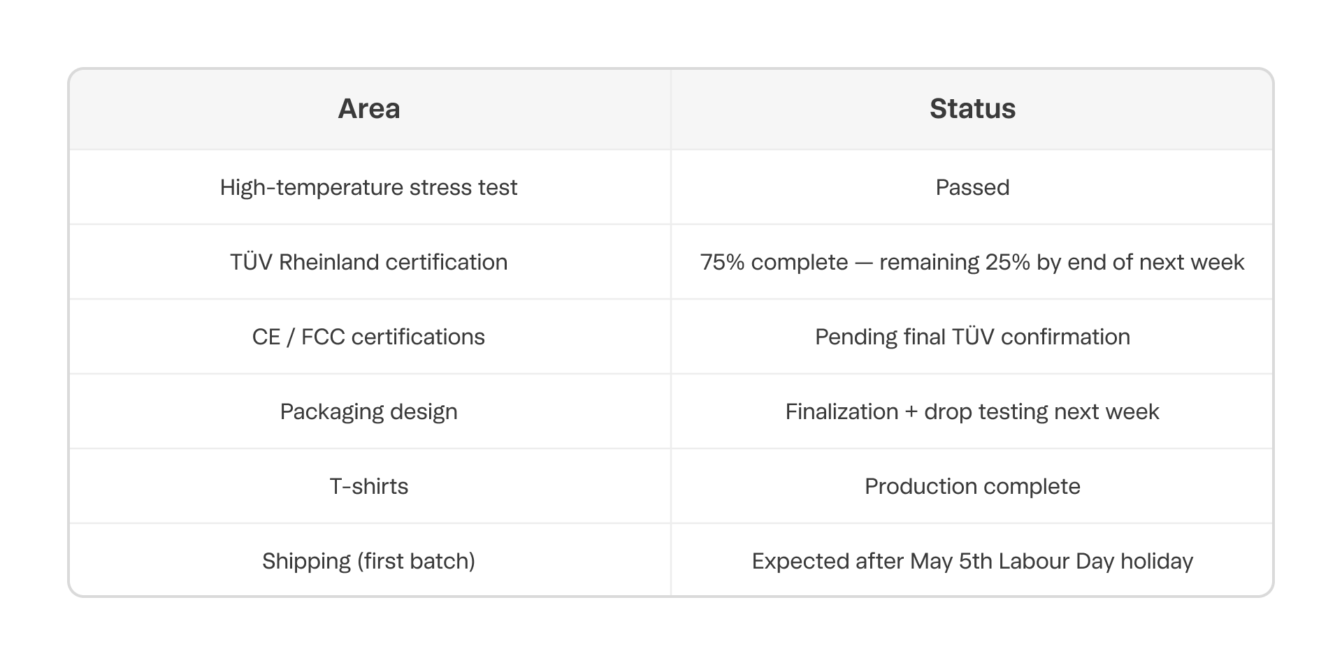 We will provide a more specific shipping update once certification is fully confirmed and packaging has cleared drop testing.